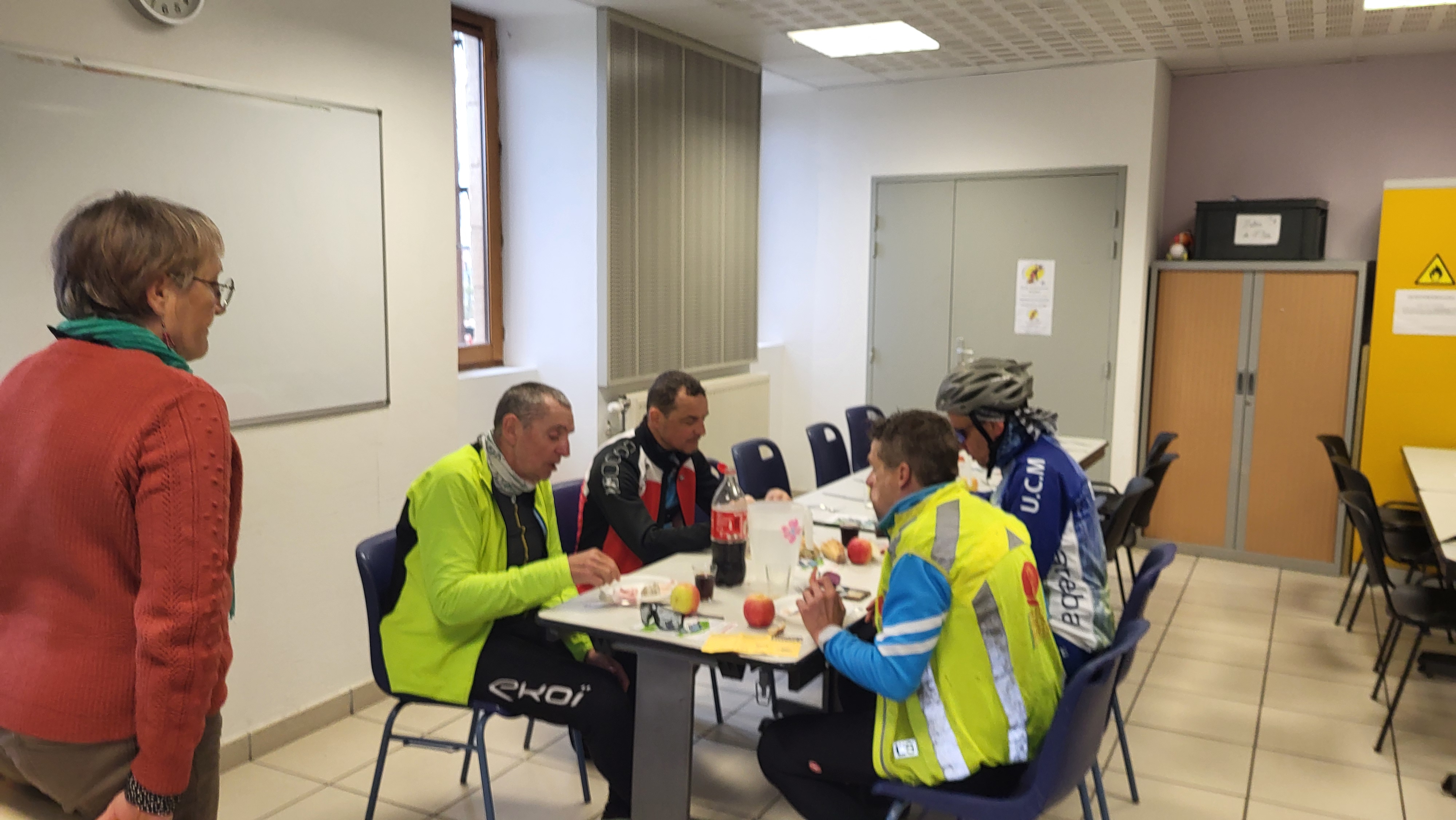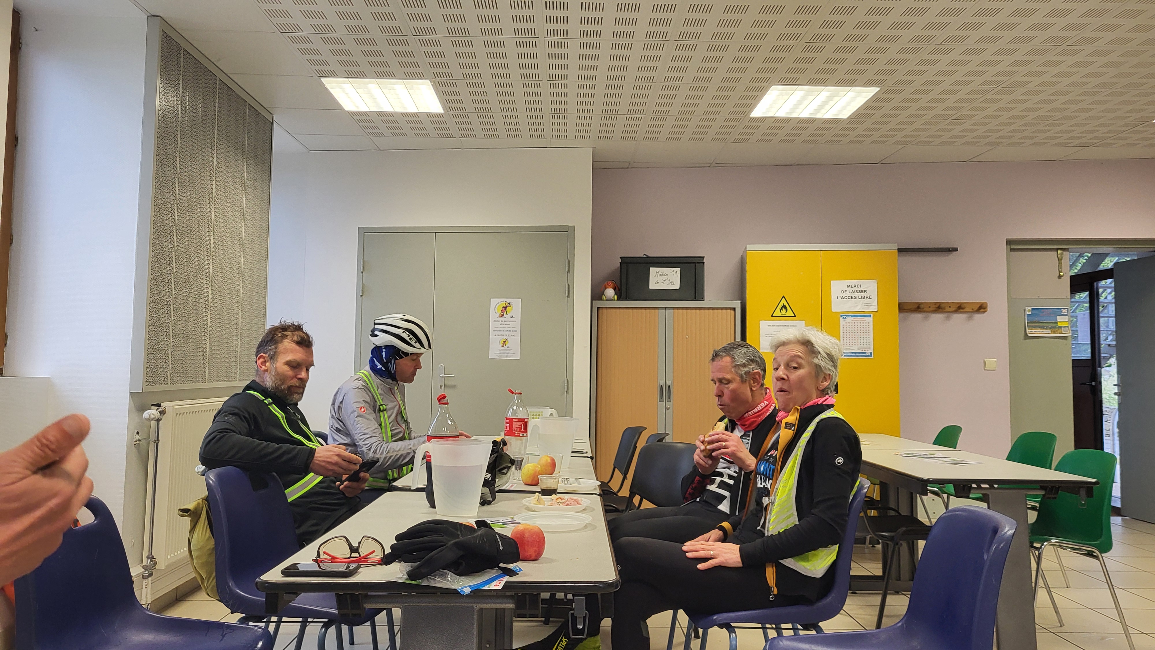 L'équipe de bénévoles de l'après-midi a été aussi formidable que celle du matin : Robert, Chantal, de nouveau Eric et son épouse Lydie et encore une fois l'ami Jean-Jacques. Tout le monde s'est affairé pour nourrir ces cyclotes et cyclos affamé.e.s et transi.e.s de froid et qui sont arrivés jusqu'à la dernière limite.