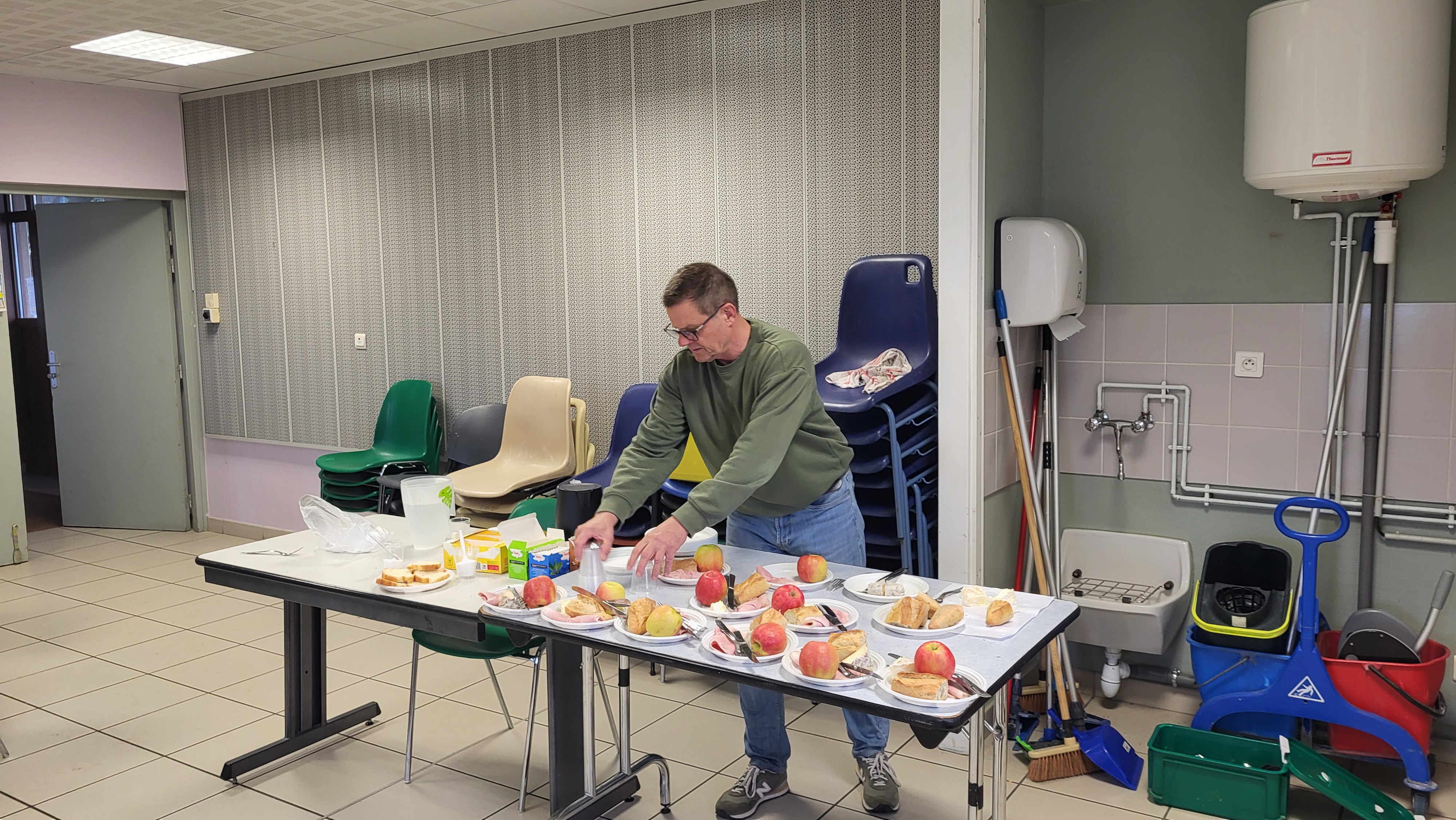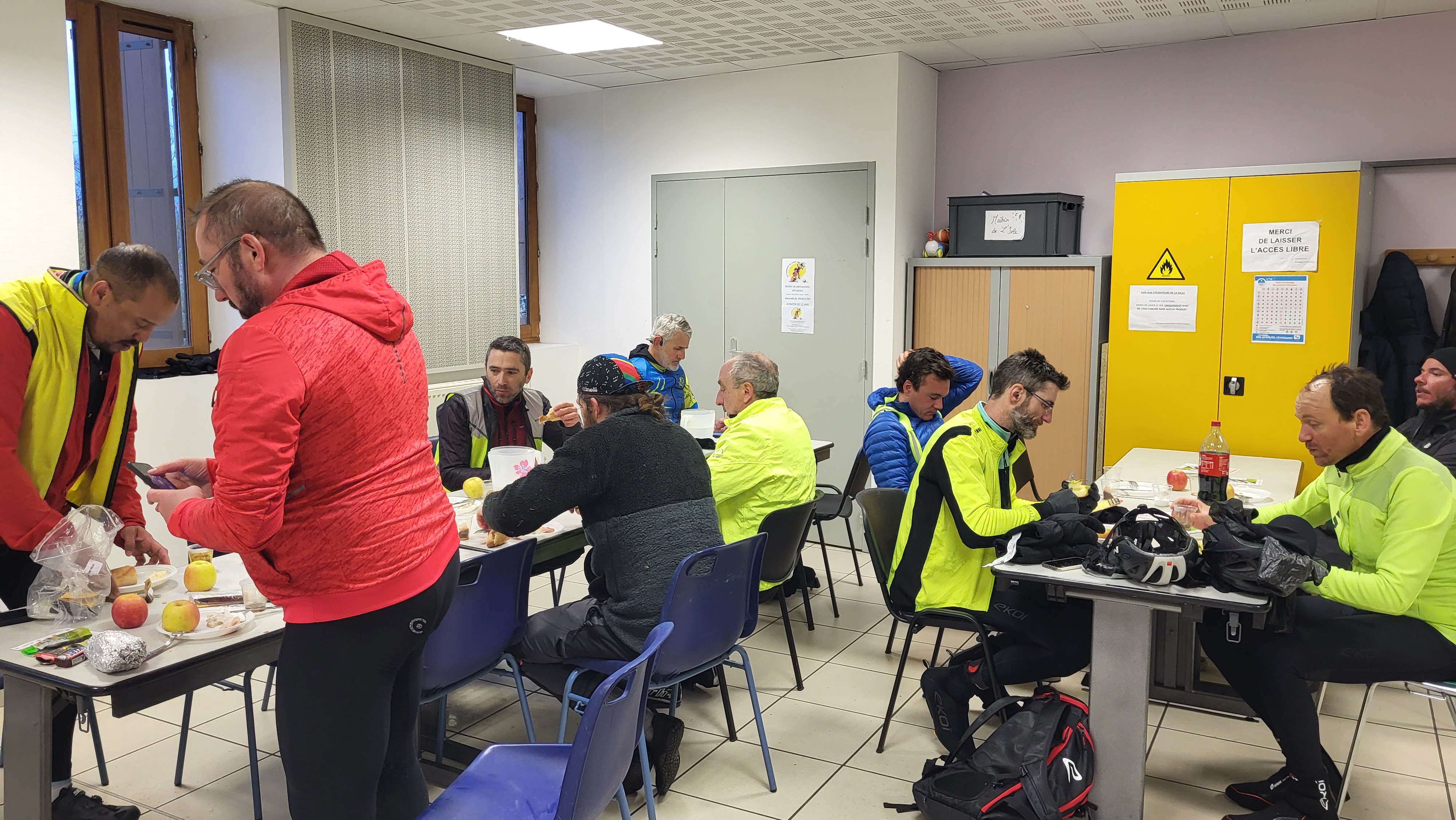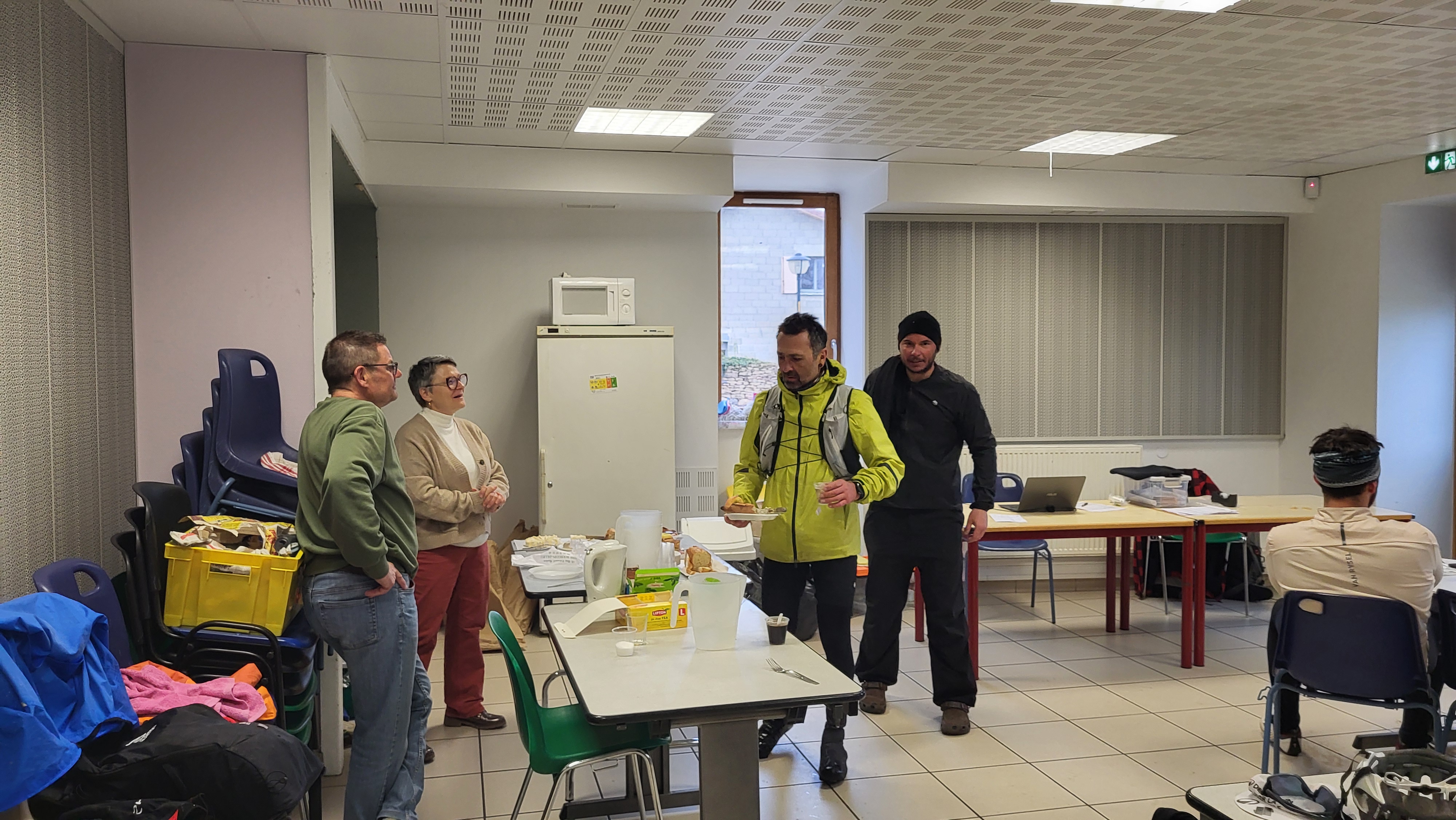 L'accueil fut frais... Entre 0° et 2°C à 6h00 du matin à l'installation de la salle. Certain.e.s sont déjà présent.e.s car venu.e.s à vélo.